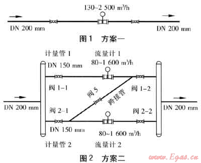圖1、2為某城市天然氣門站計(jì)量系統(tǒng)工藝管路方案一和方案二。兩個(gè)方案相比較,方案一結(jié)構(gòu)簡單,工程造價(jià)較低,方案二則相反。但是,采用兩管并聯(lián)的方案二,可以使整個(gè)計(jì)量系統(tǒng)的測量范圍從130~2500m3/h(量程比20:1)擴(kuò)展到80~3200m3/h(量程比40:1)。在門站運(yùn)行過程中,如果遇到流量波動(dòng)較大時(shí),方案二可以隨時(shí)打開或關(guān)閉兩臺流量計(jì)中的一臺,使流量計(jì)量儀表始終工作在0.2qmax到0.8qmax這一計(jì)量性能最優(yōu)的范圍段(qmax為最大流量),從而保證整個(gè)計(jì)量系統(tǒng)的計(jì)量性能最優(yōu)。另外在流量計(jì)1或流量計(jì)2中的某一臺出現(xiàn)故障或進(jìn)行周期檢定時(shí),可以使用單臺流量計(jì)供氣運(yùn)行的方式,避免城市門站供氣中斷的情況發(fā)生。