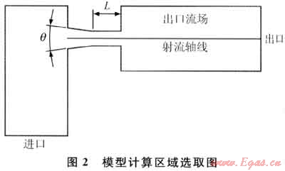 運用Fluent對9組選定的圓錐收斂型噴嘴進行數(shù)值模擬實驗,得出噴嘴性能隨內(nèi)部結(jié)構(gòu)變化趨勢,然后在性能較優(yōu)的噴嘴附近再選擇16組噴嘴進行數(shù)值模擬。模型計算區(qū)域選取見圖2。網(wǎng)格劃分:由于模鴦計算區(qū)域不大,為了加快網(wǎng)格劃分速度,采用一次性劃分網(wǎng)格,全部采用四邊形網(wǎng)格,共劃分48225個網(wǎng)格。