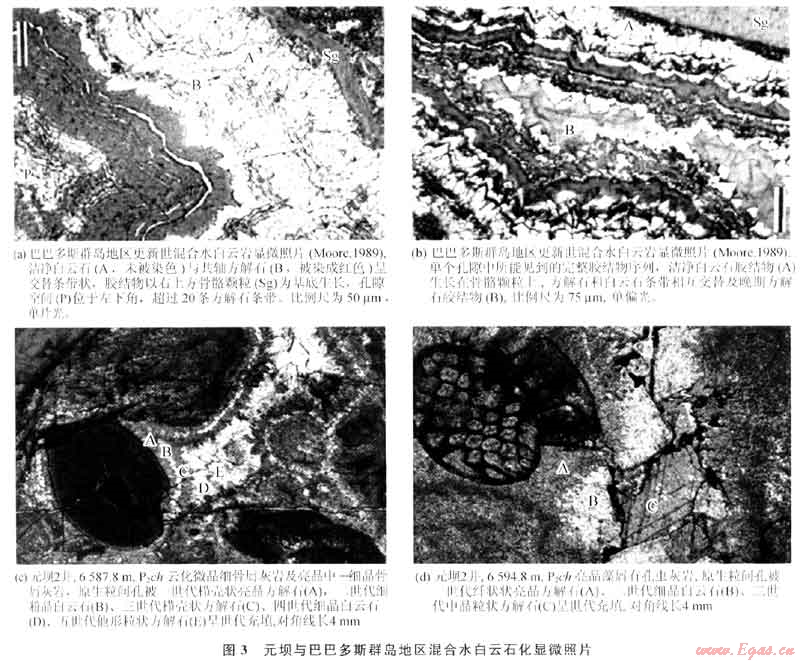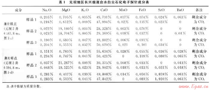 通過對(duì)比分析巴巴多斯群島更新世碳酸鹽巖混合水白云石化的情況(圖3~a,b)[5],發(fā)現(xiàn)元壩地區(qū)長(zhǎng)興組生屑灰?guī)r混合水白云石化(圖3-c,d)與其有很大的相似性:①白云石膠結(jié)物的量較低并且分布不連續(xù);②白云石膠結(jié)物經(jīng)常作為幾個(gè)不連續(xù)的透明白云石膠結(jié)物帶出現(xiàn),且被夾于透明方解石膠結(jié)物之間;③白云石干凈、明亮,方解石膠結(jié)物晶體形態(tài)從纖狀、粒狀、粉晶、中晶、巨晶不等,各期次膠結(jié)特征是晶體依次增大;④沉淀白云石膠結(jié)物的水體有很寬的組分范圍,根據(jù)電子探針對(duì)長(zhǎng)興組白云巖微量元素分析,Sr0、Na20、K2O表現(xiàn)為較低值,說明大部分白云石形成有淡水的加入[6](表1)。