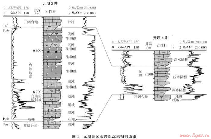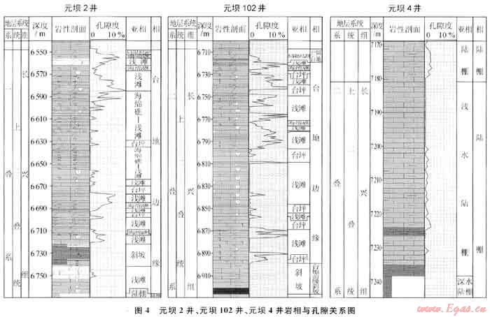 如元壩2井、元壩101井、元壩102井均在長(zhǎng)興組頂部發(fā)育了一套局限渴湖沉積環(huán)境中的同生期混合水白云巖,其下部地層溶蝕作用較強(qiáng),溶蝕孔隙發(fā)育,測(cè)井解釋的孔隙度為4%~12%(圖4),形成了一套較好的儲(chǔ)層,測(cè)試獲得高產(chǎn)天然氣硫。而元壩4井,由于在長(zhǎng)興組頂部未發(fā)育該套白云巖,其下部溶蝕作用弱,溶蝕孔隙不發(fā)育,測(cè)井解釋的孔隙度小于2%(圖4),未鉆遇儲(chǔ)層。