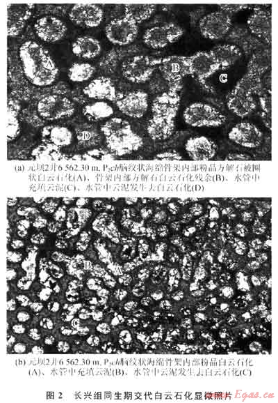 2) 主要在同生期發(fā)生的混合水白云石化對(duì)長(zhǎng)興組碳酸鹽巖儲(chǔ)層發(fā)育的重要意義在于,早期形成的白云巖在埋深過程中的高溫條件下,因壓溶作用形成的富Mg2+粒間水[10]為埋藏白云石化提供了豐富的Mg2+,有利于埋藏白云巖的形成,為儲(chǔ)層的形成奠定了基礎(chǔ)。