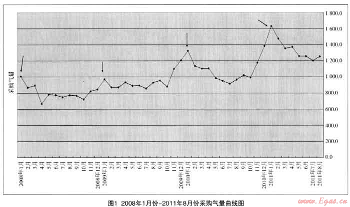 我公司天然氣購銷氣量在不斷增加的同時(shí),氣量的波動(dòng)程度即氣量的不平衡性也在不斷加大,為了分析問題,我們收集了2008年1月至2011年8月份的天然氣采購氣量及銷售氣量數(shù)據(jù),進(jìn)行了專題分析研究,得出了一些結(jié)論,分析如下: