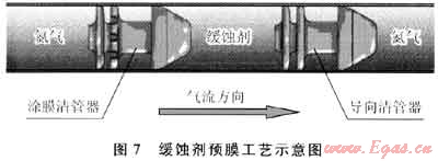 緩蝕劑預膜采用預膜型緩蝕劑與柴油按照1:1比例混合,用預膜球進行作業(yè),合理運行速度控制緩蝕劑與管道內壁接觸時間在5~10s,保證緩蝕劑在管道內壁形成3~4mil(1mil=25.39999918μm)的緩蝕劑化學膜,預膜工藝見圖7。目前按照30~60d的頻次進行緩蝕劑涂膜。