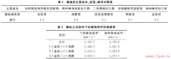 針對國外高含硫氣田已成熟應用的商業(yè)產品,結合普光氣田濕氣集輸工藝的腐蝕特點,選取了連續(xù)型和預膜型2種類型緩蝕劑。根據(jù)緩蝕劑在高含硫介質條件下的成膜特性,優(yōu)選了有機胺鹽和季胺鹽復配物、咪唑啉和吡啶衍生物、二氫噻唑衍生物、有機酰胺類復配物、咪唑啉類衍生物共5類緩蝕劑產品,具體類型見表2。