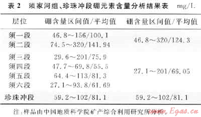 Couch[13]認(rèn)為,沉積物中的硼(B)含量多少與水體鹽度有關(guān),即水體鹽度越高,硼含量就越大,沉積物吸附的硼離子就越多,故硼可以作為指示古水體鹽度的主要標(biāo)志。據(jù)Walker等(1963)研究認(rèn)為黏土礦物中硼含量大于120mg/L為咸水;80~120mg/L為半咸水;小于80mg/L的為淡水。筆者近期對大川中及九龍山地區(qū)須家河組、侏羅系珍珠沖段地層采樣進(jìn)行了微量元素分析,結(jié)果如表2所示。