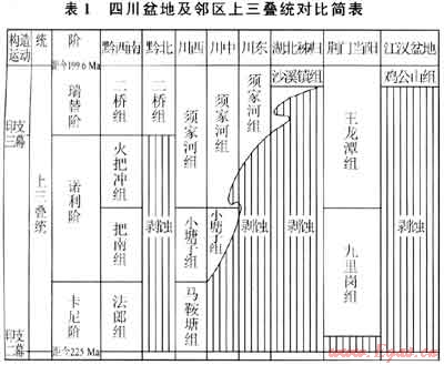 發(fā)生在三疊紀(jì)中晚期的印支二幕運動,結(jié)束了揚子地臺漫長的海相沉積歷史,在上揚子地區(qū)的晚三疊世形成了從殘留海相地層到陸相地層的地層沉積序列。以現(xiàn)今的四川盆地為代表,晚三疊世地層為一套西厚東薄、北薄的楔狀體。川西地區(qū)上三疊統(tǒng)包括海相-海陸過渡相的馬鞍塘組(垮洪洞組)、小塘子組(現(xiàn)已合稱為須一段)及須家河組(對應(yīng)須二段及其以上地層),地層厚逾4000m。川中地區(qū)上=疊統(tǒng)厚500~600m。新近完鉆的立18井須一段巖心中見石英砂巖,并在頁巖中發(fā)現(xiàn)海相雙殼類化石,更證實了須瀝積期的殘余海灣已延伸至川中地區(qū)。經(jīng)川東到鄂西醛秭歸上三疊統(tǒng)變薄相變?yōu)楹穸葍H數(shù)十米的“沙溪鎮(zhèn)”組粗碎屑沉積。經(jīng)川南到貴州西部、北部大部分地區(qū)也變薄相變?yōu)閿?shù)十米至不足200m厚的“二橋組”粗碎屑河流相砂巖沉積(表1)。