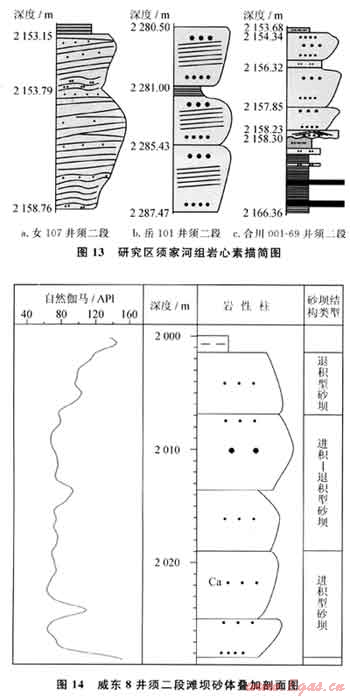 具正粒序的砂體,自然伽馬測井曲線常呈鐘形,往往被解釋為河流砂體,這是導(dǎo)致須家河組解釋為三角洲相的一個基本因素。經(jīng)巖心觀察及微觀研究,具鐘形形態(tài)的砂體除河流體外,另外是風(fēng)暴巖砂體和退積式砂壩(可能類似于羅啟后教授稱的水進(jìn)河床砂)。退積式砂壩系指當(dāng)湖平面上升速度大于灘壩砂體加積速度時,灘壩砂體退積式沉積,其上部最終演化成湖盆細(xì)粒沉積物的粉砂坪或泥坪,亦可稱之為等效湖進(jìn)灘壩。與這種退積式灘壩伴生的下部地層多為進(jìn)積式的灘壩疊加體,而向上為較深水的泥巖(圖14)。