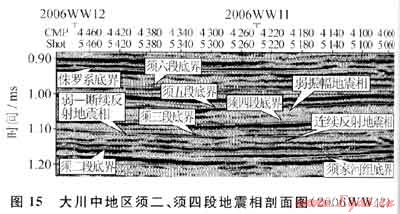 經(jīng)地震資料分析,大川中地區(qū)須家河組沉積地形相對平緩,再加上湖流、湖浪對早期沉積的三角洲相深度改造,須二、須四段不發(fā)育諸如前積、河道充填等地震相類型,而發(fā)育弱振幅地震相、斷續(xù)(弱一斷續(xù))反射地震相和連續(xù)反射地震相(圖15)。