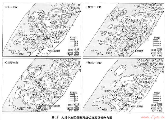 須二段在川中北部地區(qū)表現(xiàn)為辮狀河-辮狀三角洲平原沉積相。在元壩-龍崗一線以南區(qū)域進(jìn)入湖盆,形成濱淺湖灘壩沉積相(圖17-a、b)。須四、須六段沉積期,川東北地區(qū)白大巴山前緣的濕地扇、辮狀河、辮狀三角洲在龍崗、營山地區(qū)進(jìn)入湖盆,形成濱淺湖砂體沉積相(圖17-c、d)。