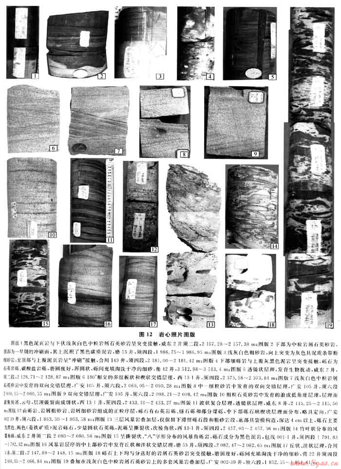元壩、廣安、南充、合川地區(qū)各段巖心中均見風(fēng)暴巖,重慶代家溝露頭等也見風(fēng)暴巖沉積。據(jù)觀察總結(jié),研究區(qū)風(fēng)暴巖有疊加在濱淺湖砂壩上、分布于淺湖泥及壩后沼澤中3種分布形式。疊加在濱淺湖砂壩上的風(fēng)暴巖反映了較強(qiáng)的風(fēng)暴浪作用,風(fēng)暴巖層底面對下伏淺灰色巖屑石英砂巖強(qiáng)烈沖刷,有的可形成袋模構(gòu)造(圖12-13)。下部的滯積礫石大多數(shù)為撕裂狀或竹葉狀或具塑性變形的泥巖礫、煤礫、碳質(zhì)泥巖礫或粉細(xì)砂巖礫,礫石呈“八”字形排列或雜亂分布(圖12-14~15)。向上砂巖略顯平行層理或出現(xiàn)丘、洼狀交錯層理(圖12-16~17)。由于多次風(fēng)暴作用,往往形成不完整的風(fēng)暴巖疊置層序(圖12-19)。風(fēng)暴巖不會出現(xiàn)在河流環(huán)境,在海洋和湖泊環(huán)境(特別是大湖)是極常見的。