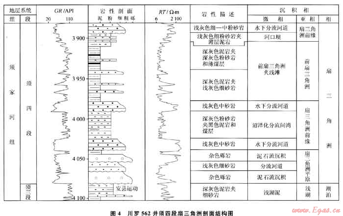主要指與四川類前陸盆地構(gòu)造演化有關(guān)的沉積充填類型和序列,據(jù)已有研究成果[10~11],盆-山耦合過(guò)程中須家河組的沉積學(xué)響應(yīng)可粗分為以下2種基本情況:①?gòu)?qiáng)烈構(gòu)造活動(dòng)期,對(duì)應(yīng)的沉積學(xué)響應(yīng)過(guò)程為粗碎屑巖占有很大比例的沖積扇(或扇三角洲)→辮狀河三角洲→湖泊沉積體系演化序列,發(fā)育粒度向上變細(xì)的退積層序;②構(gòu)造活動(dòng)平靜期,對(duì)應(yīng)的沉積學(xué)響應(yīng)過(guò)程為含煤碎屑巖建造為特征的辮狀河三角洲→湖泊-沼澤沉積體系演化序列,在三角洲沉積區(qū),具粒度向上加粗變淺的加積→進(jìn)積層序,而在湖泊沉積區(qū),具向上變淺的沉積序列。