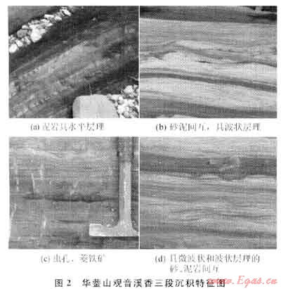 上述特征即使在可能鄰近湖泊邊緣的華鎣山觀(guān)音溪露頭剖面上也表現(xiàn)得很清楚。該剖面中的巖層被溪水沖刷得非常干凈,沉積特征十分清楚,香三、香五段以灰黑色泥頁(yè)巖為主,夾薄層灰色、灰質(zhì)細(xì)-粉粒砂巖。泥頁(yè)巖中水平和微波狀層理非常發(fā)育,其中時(shí)夾菱鐵礦條帶或菱鐵礦結(jié)核薄層,上部局部含豐富炭質(zhì)甚至成煤線(xiàn);粉砂巖具有發(fā)育的波狀層理和豐富的蟲(chóng)孔,普遍含灰質(zhì),局部成泥灰?guī)r團(tuán)塊或條帶,也夾有菱鐵礦條帶或串珠狀結(jié)核薄層(圖2)。