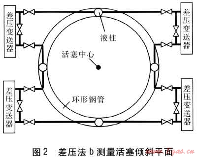 差壓法a測量活塞傾斜平面見圖1。在活塞上采用鋼管做兩個大的水平尺,互相垂直異面交叉,不連通,交叉點為活塞的中心位置。鋼管內(nèi)充有低揮發(fā)性的專用油品,每根鋼管兩端各有一個立管,管內(nèi)充有一定高度的液注,同一根鋼管的兩個立管下部分別與差壓變送器的正負(fù)壓室相連,根據(jù)液柱高差,可計算得出該方向傾斜量的大小。差壓變送器鄰近測壓點安裝。