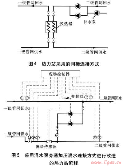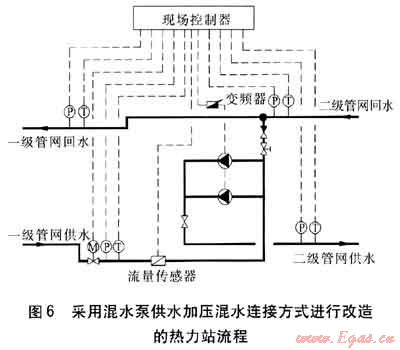 恒源熱力公司自2009年8月開始,對東北線熱網(wǎng)進行混水連接、遠程監(jiān)控技術(shù)改造。已將49座熱力站進行整合改造成混水連接熱力站30座,建設(shè)監(jiān)控中心,對熱力首站和熱力站實施監(jiān)控。改造項目包括將原有熱力站水-水換熱器、補水泵等設(shè)備拆除,進行站內(nèi)管道的改造,安裝自動調(diào)節(jié)閥、現(xiàn)場控制器。2009年11月10日,所有改造工作全部完成,至11月30日全部調(diào)試完畢,正式投入運行。改造主要考慮采用混水泵旁通加壓、混水泵供水加壓兩種連接方式。