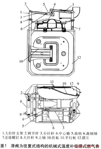 滑閥為往復(fù)式結(jié)構(gòu)的機械式溫度補償膜式燃氣表是傳統(tǒng)式結(jié)構(gòu),體積較大,見圖1。
