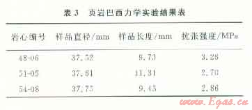 選取頁(yè)巖基質(zhì)巖石樣品,通過(guò)實(shí)驗(yàn)測(cè)量,頁(yè)巖樣品抗張強(qiáng)度介于2~4 MPa,平均為2.94 MPa(表3)。