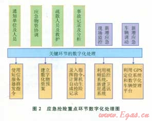 如果采用數(shù)字化指揮,還可以增加幾個常規(guī)過程所不具備的環(huán)節(jié),圖2是應急搶險關鍵環(huán)節(jié)的數(shù)字化處理思路。