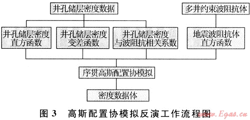 高斯配置協(xié)模擬實質(zhì)是將地質(zhì)統(tǒng)計學(xué)理論融入隨機反演中,隨機反演在一定地質(zhì)模式指導(dǎo)下進行,從而保證反演結(jié)果具有一定的地質(zhì)意義。其具體工作流程(圖3)如下:利用測井密度曲線與波阻抗反演結(jié)果的相關(guān)性,把約束稀疏脈沖波阻抗反演結(jié)果作為隨機模擬先驗信息,使其成為橫向外推的約束條件,把密度曲線作為第一類數(shù)據(jù),波阻抗結(jié)果作為第二類數(shù)據(jù),通過對常規(guī)波阻抗結(jié)果和密度曲線的直方圖、變差函數(shù)分析,用地質(zhì)統(tǒng)計學(xué)原理反演出第一類數(shù)據(jù),進而得到密度的模擬結(jié)果。