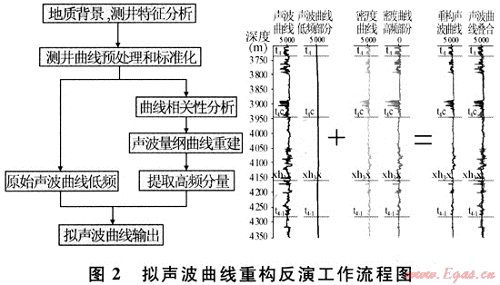將密度曲線的高頻信息加入到速度曲線的低頻背景中去,得到具有密度信息的偽速度曲線,然后將其與密度曲線乘積,得到擬波阻抗曲線,其流程見圖2。原始波阻抗與密度的相關(guān)系數(shù)為0.63,重構(gòu)后波阻抗與密度的相關(guān)系數(shù)為0.78,重構(gòu)后波阻抗與原始波阻抗的相關(guān)系數(shù)為0.81??梢娭貥?gòu)后,密度與擬聲波曲線得到的波阻抗相關(guān)性得到了提高。重構(gòu)后的聲波曲線完成的合成記錄與原始合成記錄一致,質(zhì)量更好。