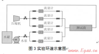 實驗流程如下:空氣由變頻壓縮機提供,通過氣體流量計后在氣液混合器內(nèi)與水混合,之后進入實驗環(huán)道;水由水泵增壓,通過流量計后與空氣在氣液混合器內(nèi)混合并進入實驗環(huán)道。最后,氣、水兩相進入到臥式分離器進行氣、水分離,之后,氣相直接排空,水則循環(huán)回水罐。