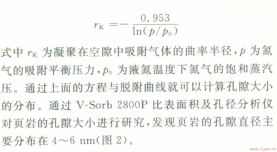 孔隙按大小可分為大孔(直徑大于50 nm),介孔(直徑介于2~50 rim)、微孑L(直徑小于2 nm)。利用氣體在頁巖孑L隙中的吸附與解吸可以測量其孔隙大小及其分布情況,當(dāng)壓力低于氣體的臨界壓力時,對于介孔與大孔,首先發(fā)生多層吸附,相對壓力更高時,則發(fā)牛毛細管凝聚,形成類似液體的彎液面。介孔孔徑分布一般用Kelvin方程進行計算。以氮氣作為吸附氣體時,當(dāng)液氮溫度為77 K時,Kelvin方程可表述如下: