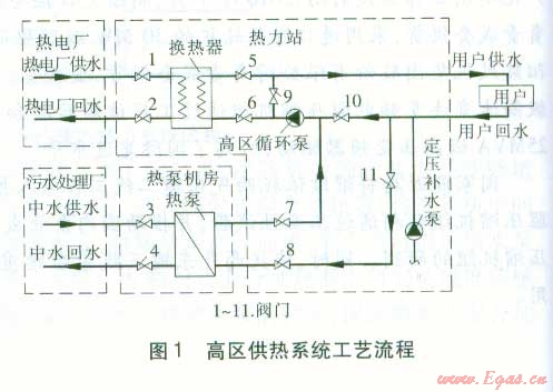 污水處理廠內(nèi)建有中水泵站l座,安裝3臺(tái)流量為625 m3h、揚(yáng)程為40 m的循環(huán)泵,流量滿足熱泵需求,中水循環(huán)泵采用變頻調(diào)速(由供回水壓差控制)。將中水作為熱泵的低溫?zé)嵩?,在小區(qū)內(nèi)建造熱泵機(jī)房1座。將熱泵作為基本熱源,承擔(dān)設(shè)計(jì)負(fù)荷的75%左右。熱電廠作為峰荷熱源,并在嚴(yán)寒期單獨(dú)運(yùn)行。小區(qū)內(nèi)建熱力站4座,由于l8層建筑比較分散,因此在1~3號(hào)熱力站內(nèi)分別設(shè)置l套高區(qū)系統(tǒng)和l套低區(qū)系統(tǒng),4號(hào)熱力站只設(shè)置l套低區(qū)系統(tǒng)。高區(qū)、低區(qū)供熱系統(tǒng)的工藝流程分別見圖1、2。
