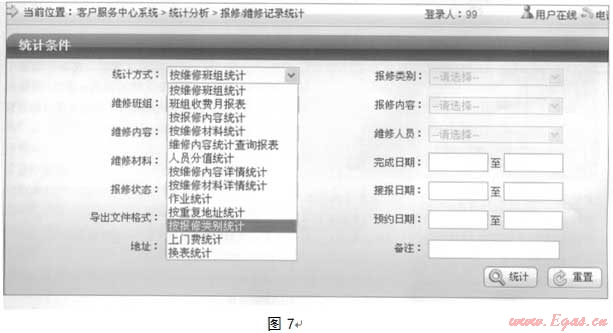 報(bào)修維修統(tǒng)計(jì)內(nèi)容比較多,可生成各類統(tǒng)計(jì)報(bào)表,可根據(jù)歷史時(shí)問統(tǒng)計(jì)報(bào)修的數(shù)量,同時(shí)支持一些關(guān)鍵篩選,如用戶報(bào)修,巡線報(bào)修等。維度可以為:維修班組、報(bào)修內(nèi)容、維修內(nèi)容、維修人員、維修班組、維修材料、以及報(bào)修類型等(見圖7)