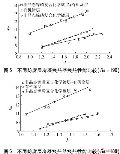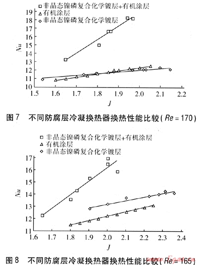 本實驗通過對不同防腐層冷凝換熱器換熱性能的測定得出,冷凝換熱器換熱性能不僅隨Re和J的增大而增強,而且對于不同防腐層的冷凝換熱器,其換熱性能隨Re和J的變化速率也不同;在相同工況下,3種不同防腐層的冷凝換熱器的換熱性能不同,非晶態(tài)鎳磷復合化學鍍層+有機涂層冷凝換熱器換熱能力最強,有機涂層冷凝換熱器換熱能力與非晶態(tài)鎳磷復合化學鍍層冷凝換熱器換熱能力相當。