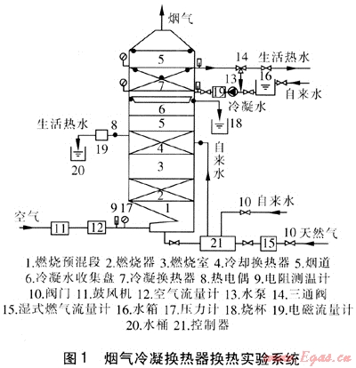 水系統(tǒng):本實驗將冷卻段和冷凝段的水路分開,讓冷卻水分兩路分別進入冷卻換熱器4和冷凝換熱器7。進入冷卻換熱器的水與煙氣換熱后流經電磁流量計19后流入水桶20中,用作生活熱水。對于進入冷凝換熱器的冷卻水,通過調節(jié)三通閥14的回水量,即調節(jié)冷熱水比例來調節(jié)冷卻水進水溫度,冷卻水與煙氣換熱,部分通過三通閥14進行循環(huán),部分流出,作為生活熱水。在冷凝段的水路上,加設水箱定壓,以消除水壓不穩(wěn)對進入冷凝換熱器的冷卻水流量的影響。