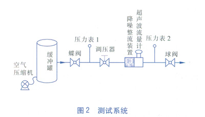 試驗(yàn)中,用來(lái)產(chǎn)生超聲波噪聲的設(shè)備是調(diào)壓器。在氣體流動(dòng)的過(guò)程中,調(diào)壓器兩側(cè)的壓力差越大所產(chǎn)生的超聲波噪聲越大。本測(cè)試的方法是:在一個(gè)容積為5m3的緩沖罐中充入空氣,使其內(nèi)部達(dá)到500kPa左右的絕對(duì)壓力,緩沖罐的一側(cè)接有DN 50mm的管道,管道上依次接有蝶閥、壓力表1、調(diào)壓器、降噪整流裝置、AS超聲波流量計(jì)、壓力表2和球閥。為了模擬實(shí)際使用現(xiàn)場(chǎng),特約束了它們之間的距離。蝶閥與壓力表1相距10D(D為管道公稱直徑),壓力表1與調(diào)壓器相距15D,調(diào)壓器與降噪整流裝置相距5D,降噪整流裝置與AS超聲波流量計(jì)直接連接,超聲波流量計(jì)與壓力表2相距10D,壓力表2與球閥相距10D,測(cè)試系統(tǒng)見(jiàn)圖2。選用的AS超聲波流量計(jì)規(guī)格為DN 50mm,始動(dòng)流量為0.37m3/h,流量范圍為3~150m3/h。