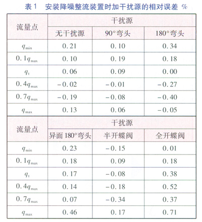 試驗(yàn)的流程為:先在被檢表位置安裝降噪整流裝置和AS超聲波流量計(jì),在無(wú)干擾源的情況下進(jìn)行檢定;檢定完成后在降噪整流裝置的上游安裝上干擾源,按照以上流量點(diǎn)再次進(jìn)行檢定。檢定完畢后統(tǒng)計(jì)數(shù)據(jù),進(jìn)行分析,具體數(shù)據(jù)見(jiàn)表1。測(cè)試了常見(jiàn)的5種干擾源,分別為:90°彎頭、180°彎頭、異面180°彎頭、半開(kāi)的蝶閥、全開(kāi)的蝶閥。
