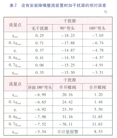為了使試驗(yàn)結(jié)果更有對(duì)比性和說(shuō)服力,對(duì)沒(méi)有安裝降噪整流裝置的AS超聲波流量計(jì)進(jìn)行了相同的試驗(yàn)。試驗(yàn)完畢后對(duì)數(shù)據(jù)進(jìn)行了統(tǒng)計(jì),具體數(shù)據(jù)見(jiàn)表2。通過(guò)數(shù)據(jù)分析,沒(méi)有安裝降噪整流裝置的AS超聲波流量汁在以上5種干擾源的環(huán)境下測(cè)量出來(lái)的相對(duì)誤差偏離非常大,最大達(dá)到了-76.11%左右。因半開(kāi)的蝶閥能使氣流的方向傾斜向管壁,對(duì)AS超聲波流量計(jì)的計(jì)量結(jié)果影響最為突出。在檢定qmax流量點(diǎn)時(shí)因受斜向氣流的干擾,AS超聲波流量計(jì)出現(xiàn)了不計(jì)量報(bào)警的異常狀態(tài)。在超聲波流量計(jì)的電子系統(tǒng)中,能有效剔除由混響、電磁干擾等引起的計(jì)量誤差的算法不能消除機(jī)械情況下的干擾引。由此說(shuō)明降噪整流裝置在整流方面起著決定性的作用。
