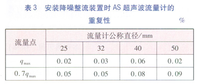據(jù)國(guó)家質(zhì)量監(jiān)督檢驗(yàn)檢疫總局發(fā)布的超聲波標(biāo)準(zhǔn)JJG 1030—2007《超聲流量計(jì)》的要求,的重復(fù)性不能超過(guò)相應(yīng)準(zhǔn)確度等級(jí)規(guī)定的最相對(duì)誤差絕對(duì)值的1/5,即作為1.5級(jí)的AS流量計(jì)的重復(fù)性,除分界流量點(diǎn)(qt)以下的應(yīng)滿足重復(fù)性≤0.6%外,其他流量點(diǎn)應(yīng)滿足≤0.3%。流量計(jì)的重復(fù)性越小,性能越好。析表3和表4中的數(shù)據(jù),安裝降噪整流裝置的As超聲波流量計(jì)的重復(fù)性比不安裝降噪整流裝置的超聲波流量計(jì)的重復(fù)性要小很多,達(dá)到0.5級(jí)AS超聲波流量計(jì)的重復(fù)性的要求。試驗(yàn)證明降噪整流裝置的整流效果在超聲波流量計(jì)的重復(fù)性方面也能體現(xiàn)。