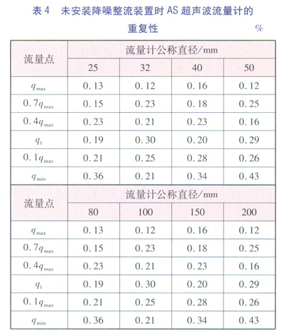 為了使得試驗(yàn)結(jié)果更具有對(duì)比性,把各個(gè)口徑的AS超聲波流量計(jì)拆下降噪整流裝置后按照所校驗(yàn)流量點(diǎn)進(jìn)行檢定,并統(tǒng)計(jì)各個(gè)流量點(diǎn)的重復(fù)性,見(jiàn)表4。