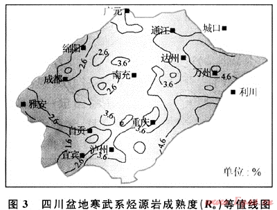 四川盆地下志留統(tǒng)泥質(zhì)烴源巖Ro值為2.2%~4.0%,已演化至過成熟階段。川南地區(qū)成熟度較低,普遍小于2.8%(圖7)。晚二疊世末,志留系源巖Ro值演化至0.9%,開始進入成油期。三疊紀之后,由于沉積速度加快,志留系埋藏速率也相應加快,志留系烴源巖在壓力和溫度作用下,熱演化加速。到中三疊世末時,很多地區(qū)的Ro值已迅速演化至1.3%。志留系烴源巖生成大量的液態(tài)烴。中侏羅世后,沉積作用仍然快速進行,志留系地層仍處于快速埋藏狀態(tài),Ro值從1.3%迅速演化至2.2%,有機質(zhì)演化至高成熟期,處于濕氣轉(zhuǎn)化階段。從白堊系開始,大部分地區(qū)的志留系烴源巖有機質(zhì)R。值都超過了3%,進入過成熟期,主要形成干氣。