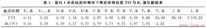 根據(jù)高科1井的沉積埋藏史圖(圖4)可見,樂山-龍女寺古隆起區(qū)下寒武統(tǒng)源巖經(jīng)歷了埋藏-抬升(剝蝕)-再埋藏-再抬升的演化過程。其有機質(zhì)生烴史可分為三期:第一期為初始生烴階段:高科1井下寒武統(tǒng)源巖在志留紀末R。值已達0.7%,處于未成熟一低成熟生烴期;第二期為生烴停滯階段,由于加里東運動的抬升作用,該井下寒武統(tǒng)源巖埋深變淺并遭受剝蝕,古地溫降低,有機質(zhì)進入生烴滯流階段;第三期為“二次生烴”階段:從二疊系開始至二疊系末,下寒武統(tǒng)源巖埋藏深度及其所具有的古地溫已超過了初始生烴階段,源巖進入了二次生烴階段。此時,高科1井毛。源巖Ro值已達0.71%,有機質(zhì)開始繼續(xù)生烴。印支末期,高科1井