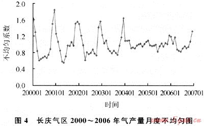 近幾年由于受國(guó)家經(jīng)濟(jì)宏觀調(diào)控政策和城市環(huán)保要求提高等因素的影響,民用、發(fā)電等用氣增長(zhǎng)較快,但民用和采暖用氣的季節(jié)性不均勻問(wèn)題突出,冬季高月和夏季低月值相差很大。中國(guó)石油每年的1、2、3、10、11、12等6個(gè)月的不均勻系數(shù)偏大(不均勻系數(shù)為月產(chǎn)量與年均月產(chǎn)量的比值),最高為12月份,連續(xù)6a的12月不均勻系數(shù)都在1.2以上,2005年不均勻系數(shù)達(dá)到了1.54的高峰,峰谷差為1.3~1.5倍(圖3)[4~5]。