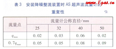 據(jù)國家質(zhì)量監(jiān)督檢驗檢疫總局發(fā)布的超聲波標(biāo)準(zhǔn)JJG 1030—2007《超聲流量計》的要求,的重復(fù)性不能超過相應(yīng)準(zhǔn)確度等級規(guī)定的最相對誤差絕對值的1/5,即作為1.5級的AS流量計的重復(fù)性,除分界流量點(qt)以下的應(yīng)滿足重復(fù)性≤0.6%外,其他流量點應(yīng)滿足≤0.3%。流量計的重復(fù)性越小,性能越好。析表3和表4中的數(shù)據(jù),安裝降噪整流裝置的As超聲波流量計的重復(fù)性比不安裝降噪整流裝置的超聲波流量計的重復(fù)性要小很多,達(dá)到0.5級AS超聲波流量計的重復(fù)性的要求。試驗證明降噪整流裝置的整流效果在超聲波流量計的重復(fù)性方面也能體現(xiàn)。