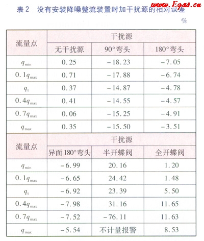 為了使試驗結(jié)果更有對比性和說服力,對沒有安裝降噪整流裝置的AS超聲波流量計進行了相同的試驗。試驗完畢后對數(shù)據(jù)進行了統(tǒng)計,具體數(shù)據(jù)見表2。通過數(shù)據(jù)分析,沒有安裝降噪整流裝置的AS超聲波流量汁在以上5種干擾源的環(huán)境下測量出來的相對誤差偏離非常大,最大達(dá)到了-76.11%左右。因半開的蝶閥能使氣流的方向傾斜向管壁,對AS超聲波流量計的計量結(jié)果影響最為突出。在檢定qmax流量點時因受斜向氣流的干擾,AS超聲波流量計出現(xiàn)了不計量報警的異常狀態(tài)。在超聲波流量計的電子系統(tǒng)中,能有效剔除由混響、電磁干擾等引起的計量誤差的算法不能消除機械情況下的干擾引。由此說明降噪整流裝置在整流方面起著決定性的作用。