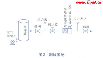 試驗中,用來產(chǎn)生超聲波噪聲的設(shè)備是調(diào)壓器。在氣體流動的過程中,調(diào)壓器兩側(cè)的壓力差越大所產(chǎn)生的超聲波噪聲越大。本測試的方法是:在一個容積為5m3的緩沖罐中充入空氣,使其內(nèi)部達(dá)到500kPa左右的絕對壓力,緩沖罐的一側(cè)接有DN 50mm的管道,管道上依次接有蝶閥、壓力表1、調(diào)壓器、降噪整流裝置、AS超聲波流量計、壓力表2和球閥。為了模擬實際使用現(xiàn)場,特約束了它們之間的距離。蝶閥與壓力表1相距10D(D為管道公稱直徑),壓力表1與調(diào)壓器相距15D,調(diào)壓器與降噪整流裝置相距5D,降噪整流裝置與AS超聲波流量計直接連接,超聲波流量計與壓力表2相距10D,壓力表2與球閥相距10D,測試系統(tǒng)見圖2。選用的AS超聲波流量計規(guī)格為DN 50mm,始動流量為0.37m3/h,流量范圍為3~150m3/h。