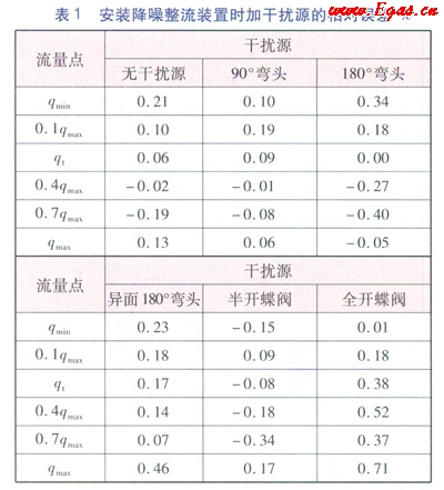 試驗的流程為:先在被檢表位置安裝降噪整流裝置和AS超聲波流量計,在無干擾源的情況下進行檢定;檢定完成后在降噪整流裝置的上游安裝上干擾源,按照以上流量點再次進行檢定。檢定完畢后統(tǒng)計數(shù)據(jù),進行分析,具體數(shù)據(jù)見表1。測試了常見的5種干擾源,分別為:90°彎頭、180°彎頭、異面180°彎頭、半開的蝶閥、全開的蝶閥。