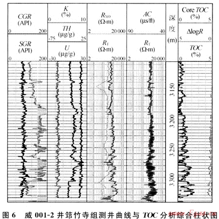 如前所述,隨深度的增加,筇竹寺組和龍馬溪組頁巖的顏色均具有自上而下逐漸加深的特點(diǎn),而其自然伽馬值和有機(jī)質(zhì)豐度也隨之逐漸增高(圖6)。威001-2是威遠(yuǎn)構(gòu)造上的一口新井,筇竹寺組的伽馬值在3175m以下明顯增加,一般都大于150API,而無論是根據(jù)測(cè)井曲線△㏒R(Passey,1989)計(jì)算的還是采用巖屑實(shí)測(cè)的TOC值,均顯示在該深度段以下一般都大于1.0%且逐漸增加的特征(圖6)。長(zhǎng)寧構(gòu)造上最近由中石油北京勘探開發(fā)研究院鉆探的1口淺井也顯示出龍馬溪組頁巖所具有的上述特征。該口淺井鉆遇了龍馬溪組中下部黑色頁巖層,110m深度段以上的TOC值一般在1.5%~2.5%之間,該深度以下TOC值劇增,均大于3%,最高約9%。