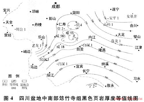 下古生界黑色頁巖集中分布在下寒武統(tǒng)筇竹寺組、下奧陶統(tǒng)大灣組和五峰組及下志留統(tǒng)龍馬溪組等4個(gè)層段中。大灣組(或大乘寺組)黑色頁巖在盆地西南部較發(fā)育,其厚度一般在45~140m,特別是在威遠(yuǎn)地區(qū)分布穩(wěn)定,也是未來下古生界頁巖氣勘探值得重視的一套目的層。五峰組黑色頁巖雖分布穩(wěn)定,但厚度較薄,一般只有幾米,且與龍馬溪組整合接觸,特征類似。限于資料,筆者僅針對(duì)筇竹寺組和龍馬溪組兩套黑色頁巖開展分析與討論。