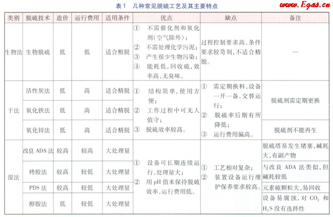 脫硫工藝一般可劃分為3類:生物法、干法、濕法。多數(shù)情況下,單項(xiàng)脫硫工藝很難完全滿足要求,通常需要采用組合工藝,例如生物法進(jìn)行粗凈化,吸附法(干法)進(jìn)行深度凈化。表1列舉了常見(jiàn)的幾種脫硫工藝及其主要特點(diǎn)[2]。