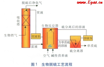 生物燃?xì)庥晌账撞窟M(jìn)入,貧液泵將生物反應(yīng)器中貧液(堿性營(yíng)養(yǎng)吸收液)打入吸收塔頂,兩者在塔內(nèi)逆向接觸反應(yīng),生物燃?xì)庵械?/span>H2S被貧液吸收,成為含有大量H2S的富液;該富液自吸收塔底部進(jìn)入生物反應(yīng)器,生物反應(yīng)器內(nèi)裝填有微生物(各類硫桿菌等),在通入空氣環(huán)境下,富液中的H2S通過(guò)微生物的好氧反應(yīng)被氧化成單質(zhì)硫沉積于生物反應(yīng)器底部;這樣,富液得以再生為貧液,由貧液泵再次送入吸收塔,吸收生物燃?xì)庵械?/span>H2S。由此構(gòu)成“吸收一再生”循環(huán)過(guò)程。