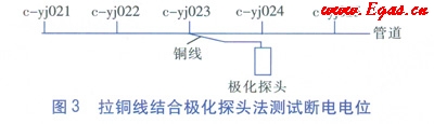 為了得到管道任意位置的陰極保護(hù)數(shù)據(jù),包括定向鉆穿越段中間部位、丟失的測試樁、占壓無法打開的測試井等處的陰極保護(hù)數(shù)據(jù),擬采用拉銅線和極化探頭相結(jié)合的方法進(jìn)行測試。為了驗(yàn)證該方法的可靠性及準(zhǔn)確性,選取c-yj024測試樁作為管道上任意測試點(diǎn)。步驟為:
