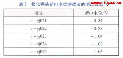 極化探頭[2]的極化試片在充分極化后,斷掉陰極保護(hù)電流,極化試片上的土壤IR降(陰極保護(hù)電流產(chǎn)生的IR降和雜散電流產(chǎn)生的IR降)瞬間等于零,在0.5s內(nèi)讀取的數(shù)據(jù)為管道的斷電電位(測試數(shù)據(jù)見表2)。這樣不僅能消除陰極保護(hù)電流產(chǎn)生的IR降,還能消除雜散電流產(chǎn)生的IR降,能得到管道真實(shí)的陰極保護(hù)電位。本方法適用于受雜散電流干擾或無法同步中斷陰極保護(hù)電流的管道,尤其適用于犧牲陽極陰極保護(hù)的城鎮(zhèn)燃?xì)夤艿赖臏y試。