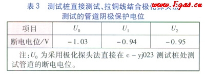 c.在c-yj023測試樁連接銅線,拉銅線到c-yj024測試樁附近,連接c-yj024測試樁附近的極化探頭,測得斷電電位%,極化探頭的埋設(shè)位置與在c-yj024測試樁直接測試斷電電位時(shí)埋設(shè)位置相同(測試方法見圖3),測試數(shù)據(jù)見表3。