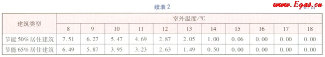 根據(jù)文獻(xiàn)[1]及GB 50736—2012《民用建筑供暖通風(fēng)與空氣調(diào)節(jié)設(shè)計(jì)規(guī)范》、JCJ 26—2010《嚴(yán)寒和寒冷地區(qū)民用建筑節(jié)能設(shè)計(jì)標(biāo)準(zhǔn)》、JGJ 26—5《民用建筑節(jié)能設(shè)計(jì)標(biāo)準(zhǔn)(供暖居住建筑部分)》規(guī)定的汁算參數(shù),以烏魯木齊市供熱區(qū)域內(nèi)某居住建筑為例,進(jìn)行能耗分析。該建筑坐北朝南,共6層,建筑高度為16.8m,總建筑面積為4112.64m2,體形系數(shù)為0.28。節(jié)能50%居住建筑外墻傳熱系數(shù)為0.43W/(m2·K),外窗的傳熱系數(shù)為2.47W/(m2·K);節(jié)能65%居住建筑外墻傳熱系數(shù)為0.35W/(m2·K),外窗傳熱系數(shù)為1.8W/(m2·K)。計(jì)算得出不同室外溫度(室外溫度取整數(shù))時(shí),該居住建筑分別節(jié)能65%、50%時(shí)的供暖熱負(fù)荷指標(biāo),計(jì)算結(jié)果見表2。當(dāng)室外溫度達(dá)到16℃時(shí),鍋爐停止供暖,熱負(fù)荷指標(biāo)為0,但由于烏魯木齊的晝夜溫差可逾20℃,因此存在白天停止供暖,傍晚及夜間又恢復(fù)供暖的情況。