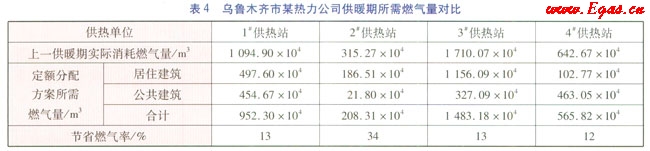 按照定額分配方案,將供暖熱負(fù)荷指標(biāo)代入上述公式,計(jì)算出不同室外溫度下單位時(shí)間所需燃?xì)饬浚M(jìn)而推算出在烏魯木齊的氣象條件下,各供熱單位在一個(gè)供暖期(183d)內(nèi)所需燃?xì)饬?,并與實(shí)際消耗燃?xì)饬窟M(jìn)行比較,比較結(jié)果見表4。